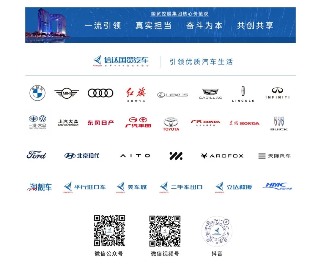 汽車板塊是國貿(mào)控股集團(tuán)重要核心業(yè)務(wù)之一。近年來,信達(dá)國貿(mào)汽車直面挑戰(zhàn)搶抓機(jī)遇,不斷擴(kuò)展新業(yè)務(wù)、新領(lǐng)域。品牌經(jīng)銷申請屢獲突破,北京紅旗、深圳紅旗、泉州紅旗、泉州林肯、福州賽力斯、廈門極狐、廈門智己、武漢智己一店、武漢智己二店等陸續(xù)獲批;新能源品牌發(fā)展壯大,二手車業(yè)務(wù)增長迅猛,數(shù)字化營銷模式創(chuàng)新發(fā)力,逐步實現(xiàn)銷售服務(wù)、售后服務(wù)的數(shù)字化、網(wǎng)絡(luò)化。信達(dá)國貿(mào)汽車將堅持以創(chuàng)新性形式服務(wù)廣大客戶,踐行國企擔(dān)當(dāng),履行社會責(zé)任。